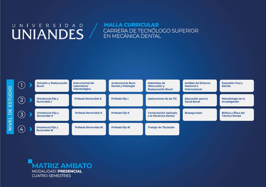Período Académico 3: Ortodoncia Fija y Removible II, Prótesis Removible II, Prótesis Fija II, Computación Aplicada a la Mecánica Dental, Bioseguridad, Bioética y Ética del Técnico Dental.